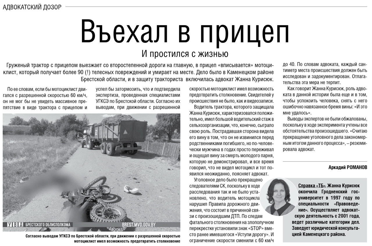 Очередная публикация с участием адвоката Брестской областной коллегии на страницах газеты «Транспортный вестник».