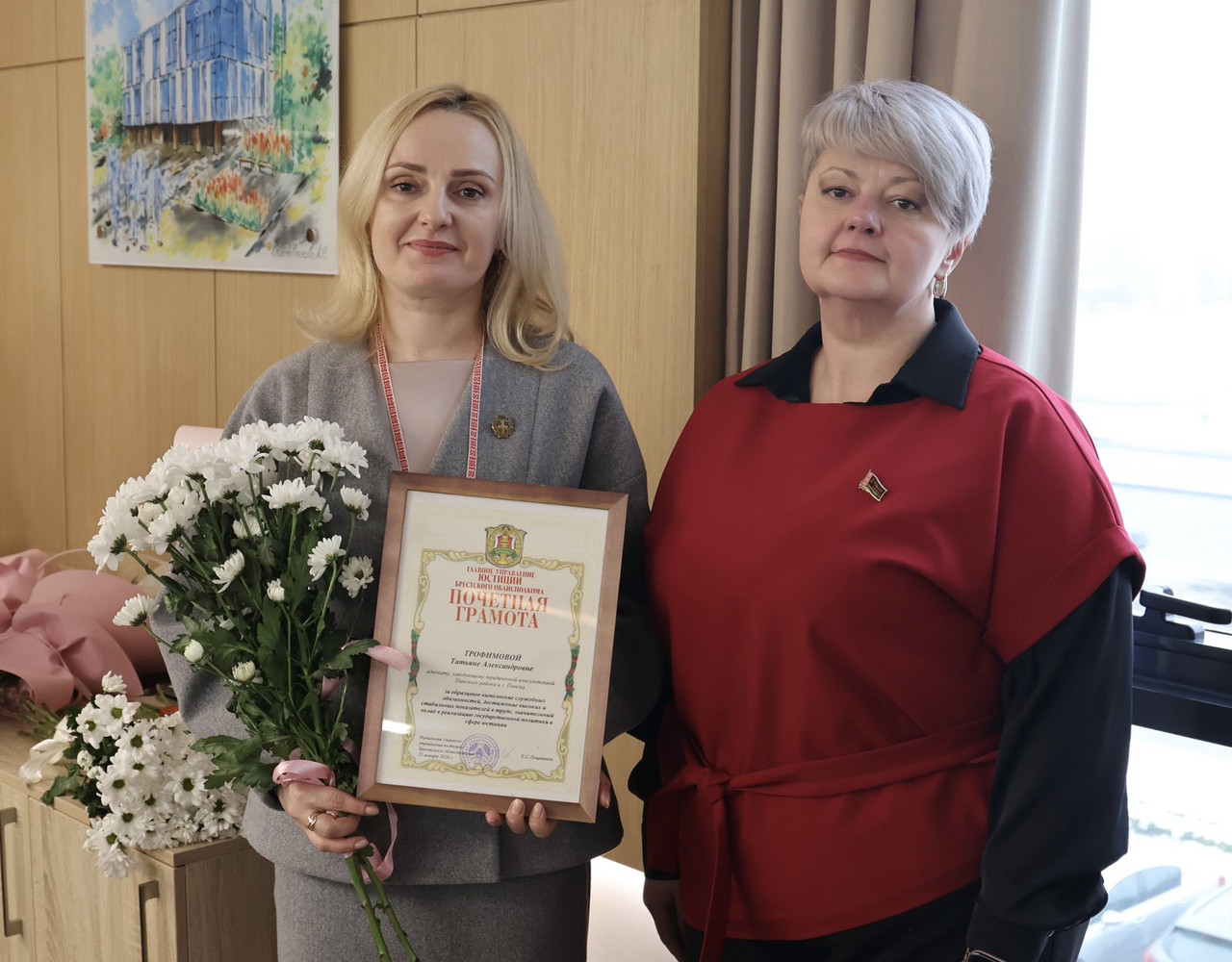 За образцовое выполнение служебных обязанностей, достижение высоких и стабильных показателей в труде Почетной грамотой главного управления юстиции Брестского облисполкома награждена Татьяна Трофимова, заведующий юридической консультацией Пинского района и г. Пинска, Благодарность главного управления юстиции Брестского облисполкома объявлена Татьяне Павлюкович, заведующему юридической консультацией Ленинского района г. Бреста.