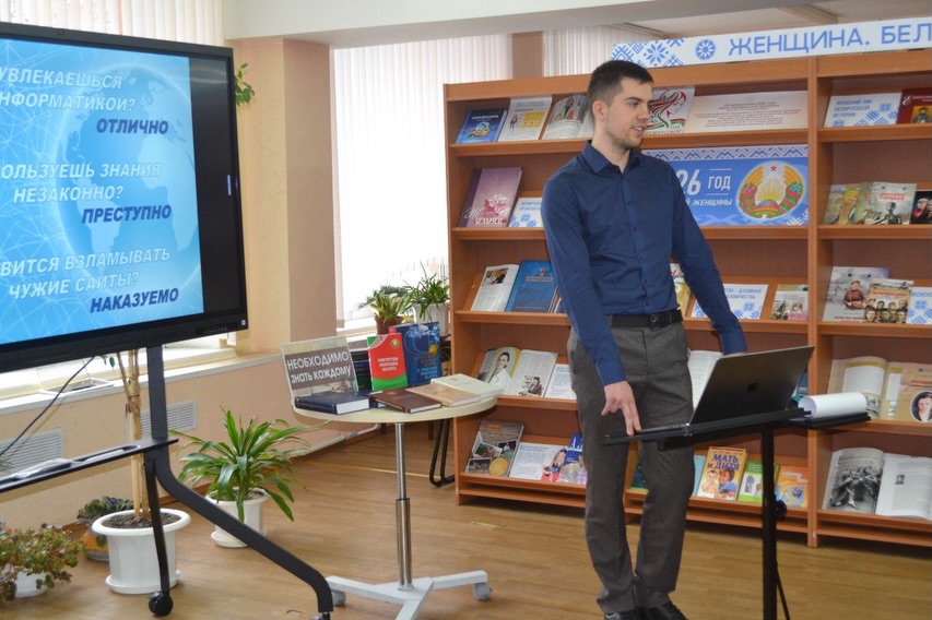 Адвокат юридической консультации Пинского района и г. Пинска Денис Комар выступил перед учащимися 10-го класса средней школы №12 г. Пинска на тему: «Мой безопасный интернет». Встреча прошла на базе Пинской городской библиотеки.